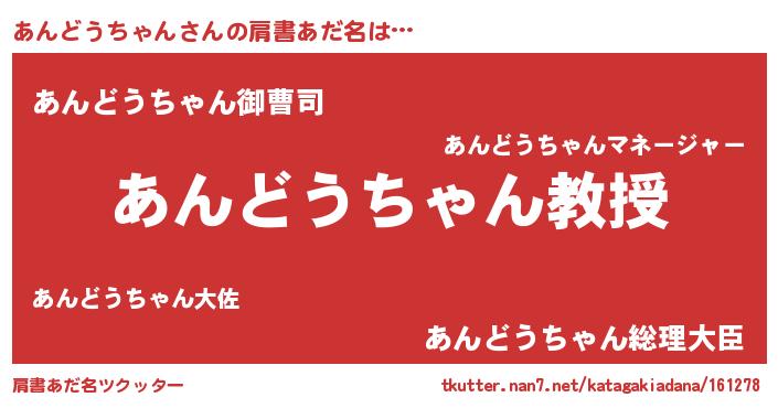 | 男性向けラノベタイトル風あだ名 | 『おまえをオタクにしてやるから、俺をあんどうちゃんにしてくれ! 』 |