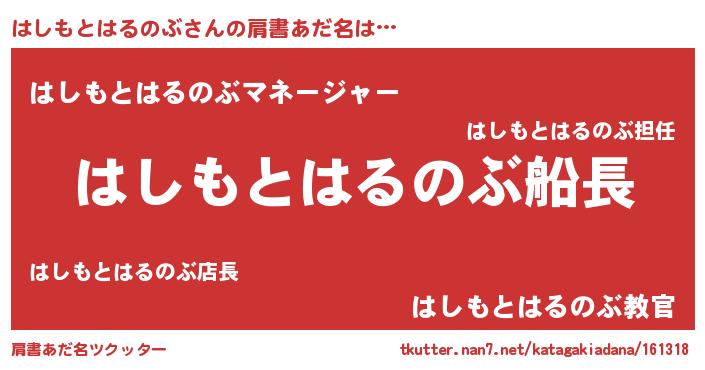 | ヘコむあだ名 | 『はしもとはるのぶ(小並感)』『はしにー』 |