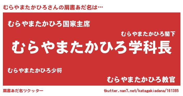 | 男性向けラノベタイトル風あだ名 | 『おまえをオタクにしてやるから、俺をむらやまたかひろにしてくれ! 』 |