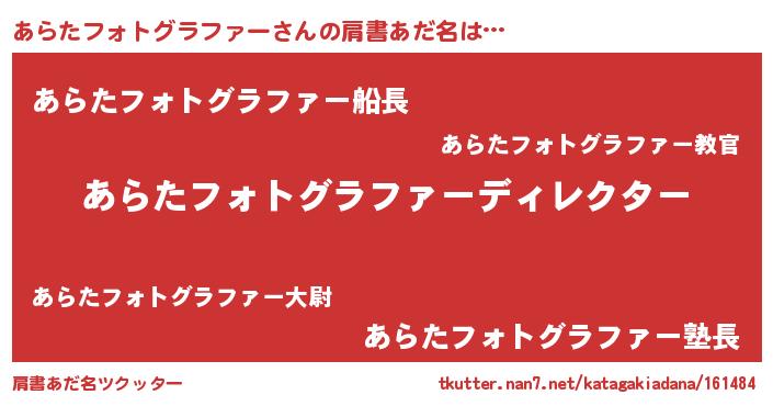 | 男性向けラノベタイトル風あだ名 | 『あらたフォトグラファーに滅ぼされるだけの簡単なお仕事です』 |