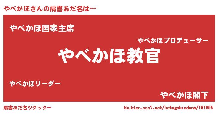 | 男性向けラノベタイトル風あだ名 | 『この素晴らしい世界にやべかほを!』 |