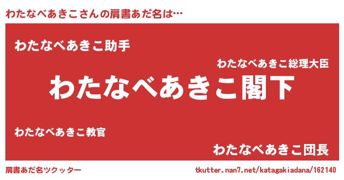 | 男性向けラノベタイトル風あだ名 | 『Re:わたなべあきこから始める異世界生活』 |