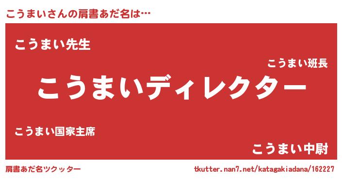 | 男性向けラノベタイトル風あだ名 | 『こうまいに滅ぼされるだけの簡単なお仕事です』 |