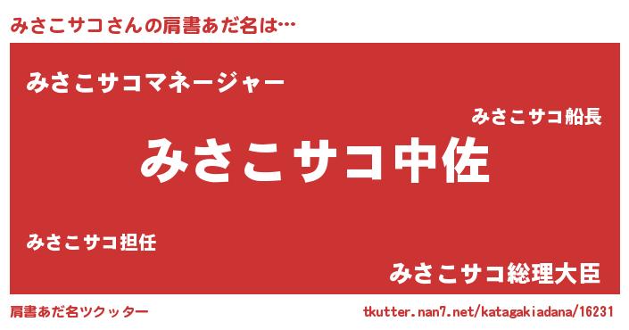 | 男性向けラノベタイトル風あだ名 | 『転生したらみさこサコだった件』 |