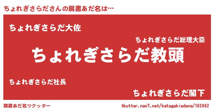 | 男性向けラノベタイトル風あだ名 | 『ちょれぎさらだという概念が存在しない退屈な世界 』 |
