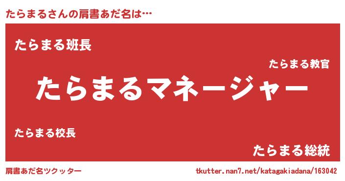 | 男性向けラノベタイトル風あだ名 | 『はたらくたらまるさま!』 |