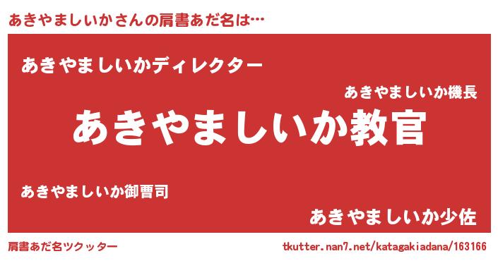 | 男性向けラノベタイトル風あだ名 | 『この素晴らしい世界にあきやましいかを!』 |