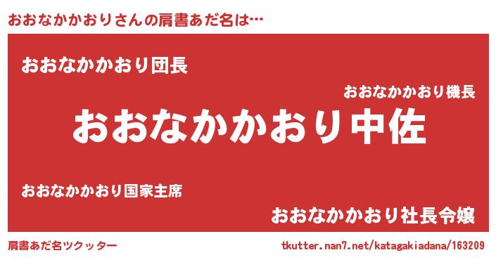 | 男性向けラノベタイトル風あだ名 | 『おおなかかおり~年齢イコール彼女いない歴の魔法使い~』 |