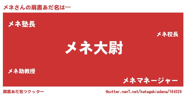 | 男性向けラノベタイトル風あだ名 | 『メネスレイヤー』『はたらくメネさま!』 |