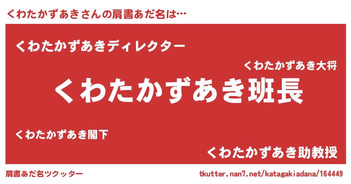 | 男性向けラノベタイトル風あだ名 | 『くわたかずあきの嫁は女の子じゃないと思った?』 |