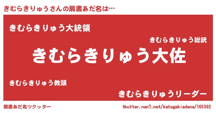 | 男性向けラノベタイトル風あだ名 | 『きむらきりゅう~年齢イコール彼女いない歴の魔法使い~』 |