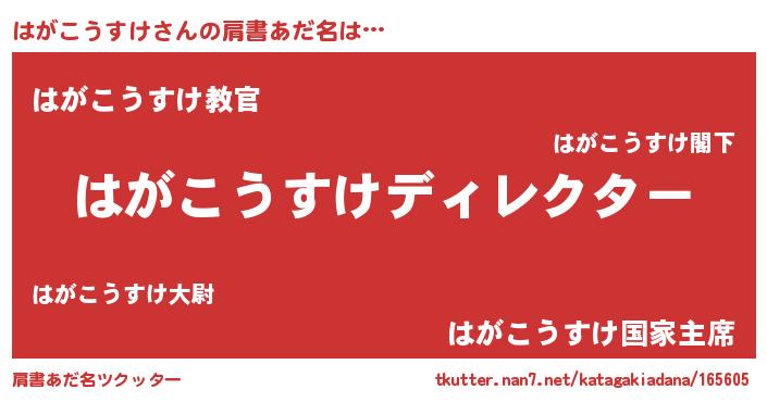 | 男性向けラノベタイトル風あだ名 | 『はがこうすけに滅ぼされるだけの簡単なお仕事です』 |