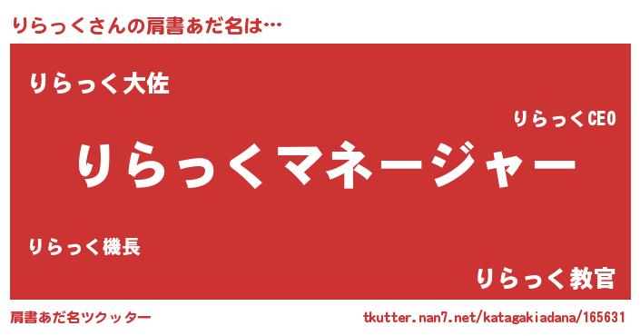 | 男性向けラノベタイトル風あだ名 | 『はたらくりらっくさま!』 |