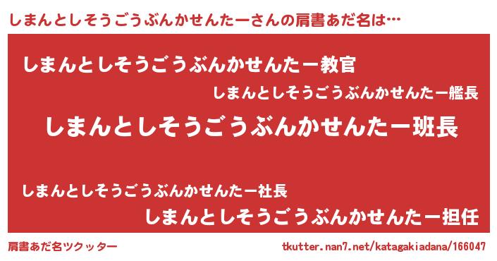 | 女子向けラノベタイトル風あだ名 | 『しまんとしそうごうぶんかせんたーの卵を拾いまして』 |