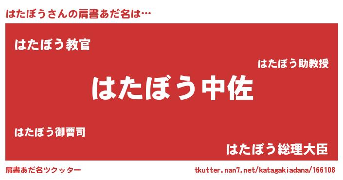 | 男性向けラノベタイトル風あだ名 | 『はたぼう~年齢イコール彼女いない歴の魔法使い~』 |