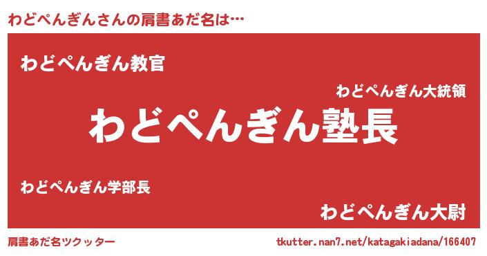 | 意味不明あだ名 | 『とにかく怪しいわどぺんぎん』 |