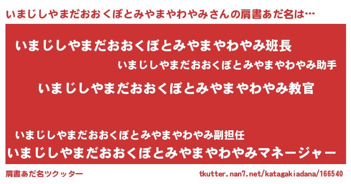 | 伝説のあだ名 | 『解き放たれた僧侶いまじしやまだおおくぼとみやまやわやみ』 |