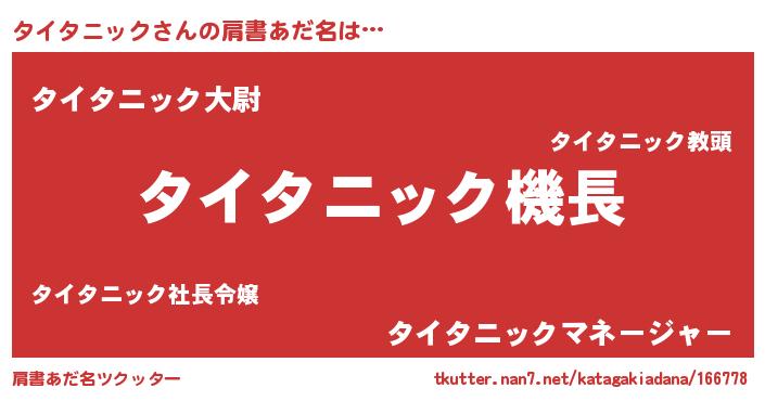 | 男性向けラノベタイトル風あだ名 | 『緋弾のタイタニック』 |