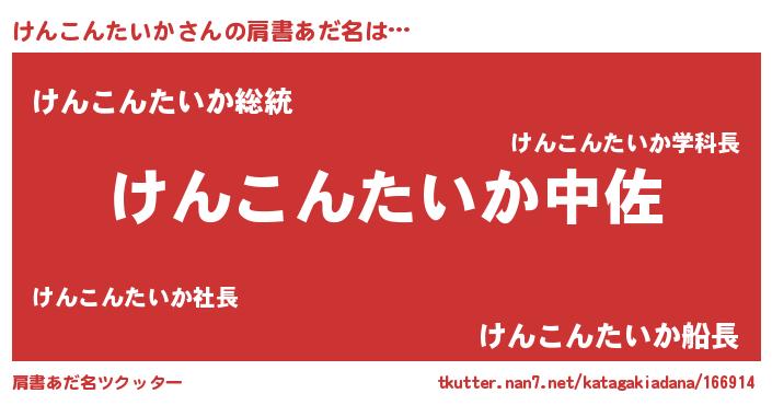 | 男性向けラノベタイトル風あだ名 | 『転生したらけんこんたいかだった件』 |