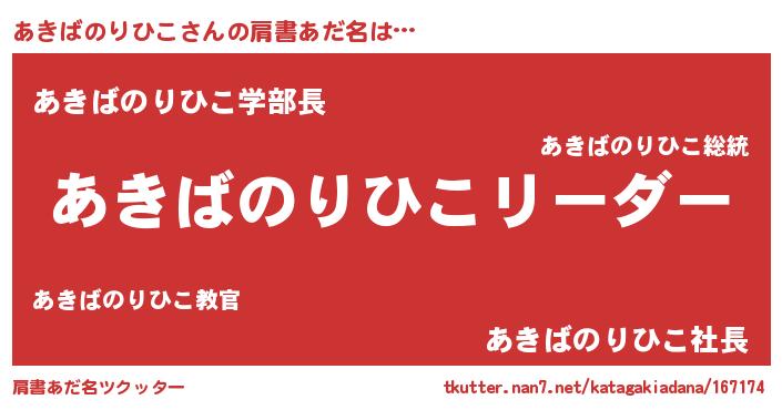 | 男性向けラノベタイトル風あだ名 | 『あきばのりひこの嫁は女の子じゃないと思った?』 |