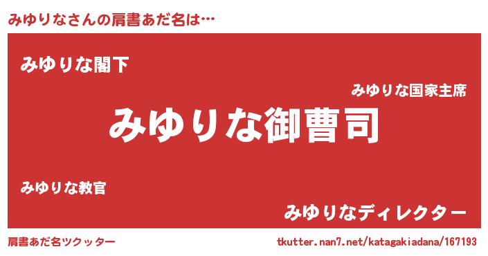 | 男性向けラノベタイトル風あだ名 | 『みゆりなの憂鬱』『魔弾の王とみゆりな』 |