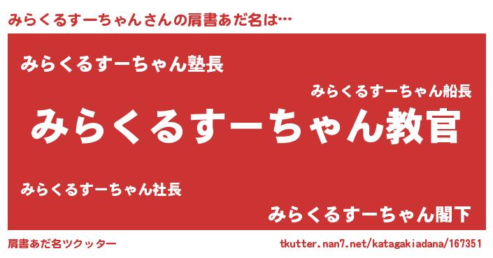 | 男性向けラノベタイトル風あだ名 | 『魔弾の王とみらくるすーちゃん』 |