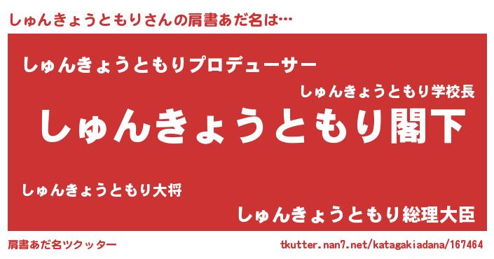 | 女子向けラノベタイトル風あだ名 | 『しゅんきょうともりなんてお断りですっ。』 |
