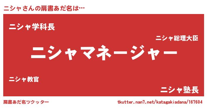 | 男性向けラノベタイトル風あだ名 | 『ニシャに滅ぼされるだけの簡単なお仕事です』 |