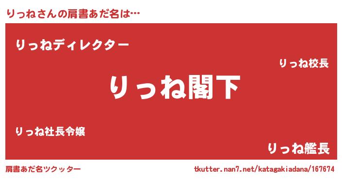 | 男性向けラノベタイトル風あだ名 | 『Re:りっねから始める異世界生活』 |