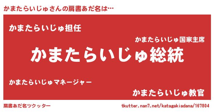 | 女子向けラノベタイトル風あだ名 | 『かまたらいじゅなんてお断りですっ。』 |