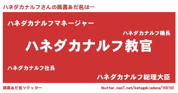 | 男性向けラノベタイトル風あだ名 | 『この素晴らしい世界にハネダカナルフを!』 |