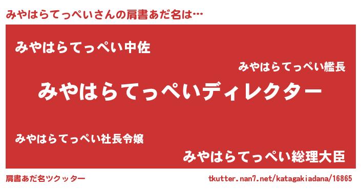| 男性向けラノベタイトル風あだ名 | 『みやはらてっぺいに滅ぼされるだけの簡単なお仕事です』 |