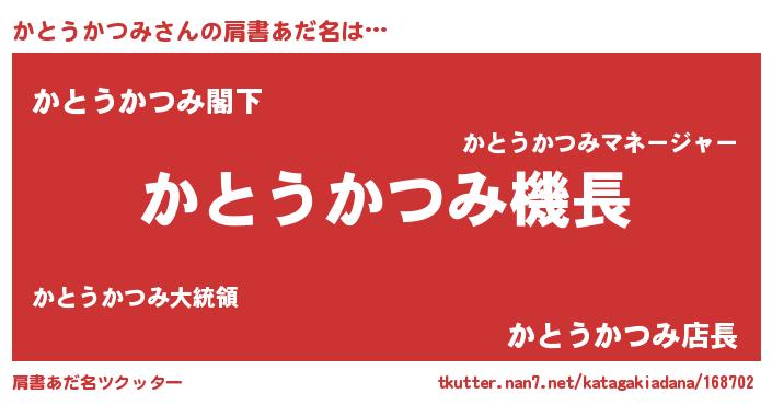 | 男性向けラノベタイトル風あだ名 | 『うちのかとうかつみが世界を掌握している!』 |