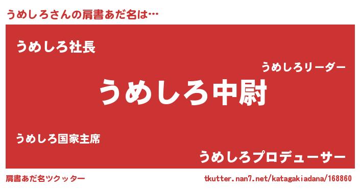 | 男性向けラノベタイトル風あだ名 | 『うめしろ~年齢イコール彼女いない歴の魔法使い~』 |