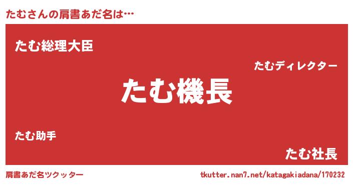 | 男性向けラノベタイトル風あだ名 | 『うちのたむが世界を掌握している!』 |