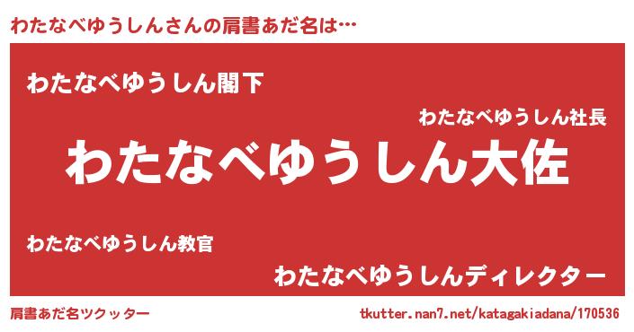 | 男性向けラノベタイトル風あだ名 | 『転生したらわたなべゆうしんだった件』 |