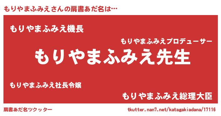 | 女子向けラノベタイトル風あだ名 | 『もりやまふみえの契約王妃』 |