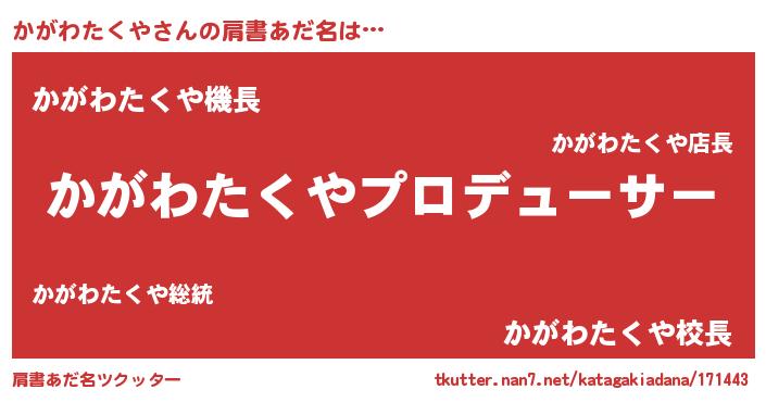 | ヘコむあだ名 | 『かがわたくや(遠い目)』『かがっふぃ~』 |