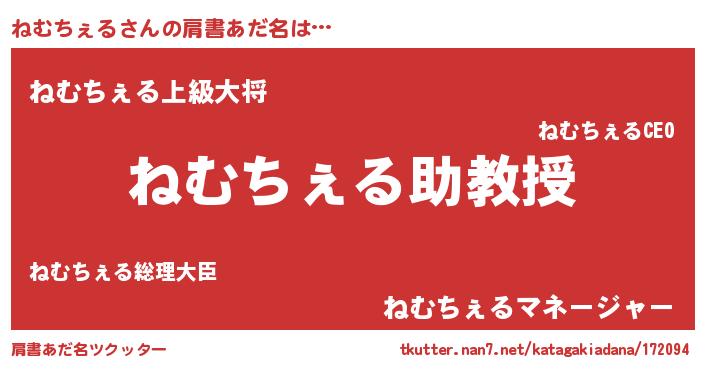| 男性向けラノベタイトル風あだ名 | 『おまえをオタクにしてやるから、俺をねむちぇるにしてくれ! 』 |