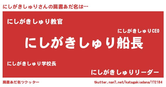 | 男性向けラノベタイトル風あだ名 | 『うちのにしがきしゅりが世界を掌握している!』 |