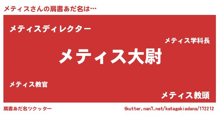 | 男性向けラノベタイトル風あだ名 | 『メティス~年齢イコール彼女いない歴の魔法使い~』 |