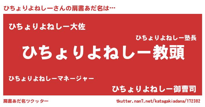 | 男性向けラノベタイトル風あだ名 | 『ひちょりよねしーという概念が存在しない退屈な世界 』 |