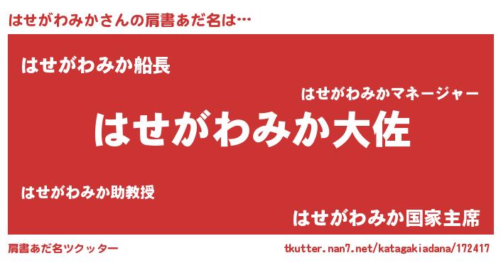 | 男性向けラノベタイトル風あだ名 | 『はせがわみか~年齢イコール彼女いない歴の魔法使い~』 |