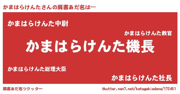 | 男性向けラノベタイトル風あだ名 | 『うちのかまはらけんたが世界を掌握している!』 |