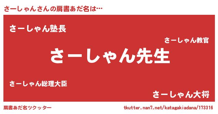| 男性向けラノベタイトル風あだ名 | 『さーしゃんという概念が存在しない退屈な世界 』 |