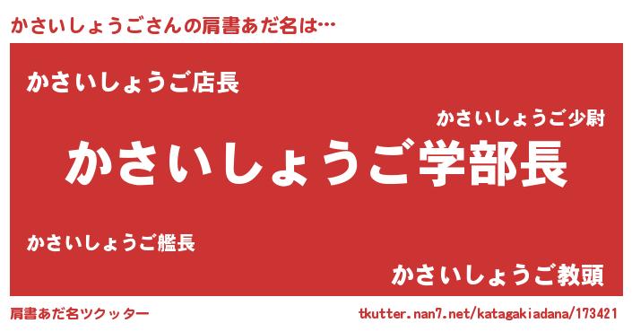 | 男性向けラノベタイトル風あだ名 | 『ノーゲーム・ノーカサイショウゴ』 |