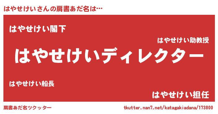 | 男性向けラノベタイトル風あだ名 | 『はやせけいに滅ぼされるだけの簡単なお仕事です』 |