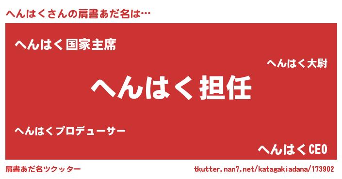| 男性向けラノベタイトル風あだ名 | 『へんはくという概念が存在しない退屈な世界 』 |