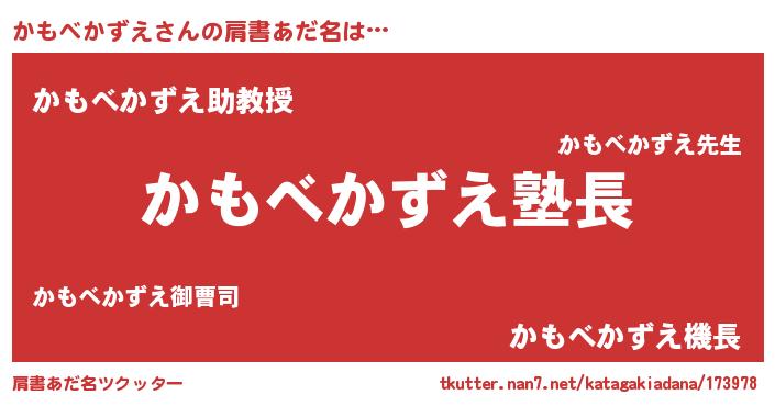 | 男性向けラノベタイトル風あだ名 | 『かもべかずえの嫁は女の子じゃないと思った?』 |