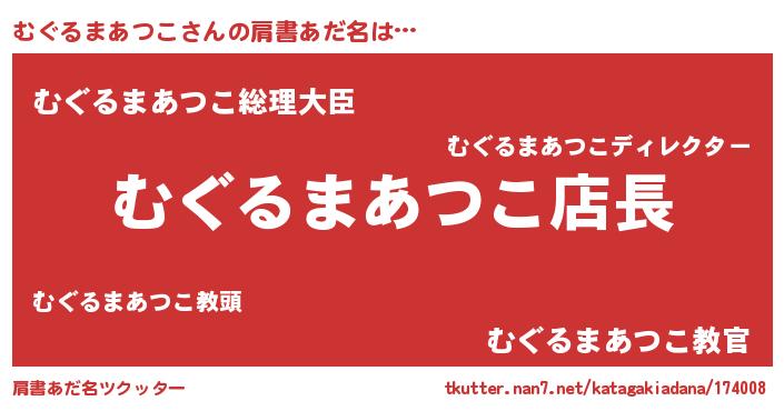 | 男性向けラノベタイトル風あだ名 | 『むぐるまあつこの憂鬱』 |